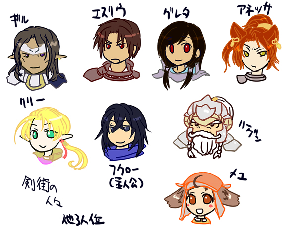 キャラメイクゲーなんですが、全員エスカリオという剣の街、ていうか異世界に飛ばされた現代人(異邦人と呼ばれる)という設定なので、エルフとかドワーフとかになってる人もいますが元はフツーの人です。